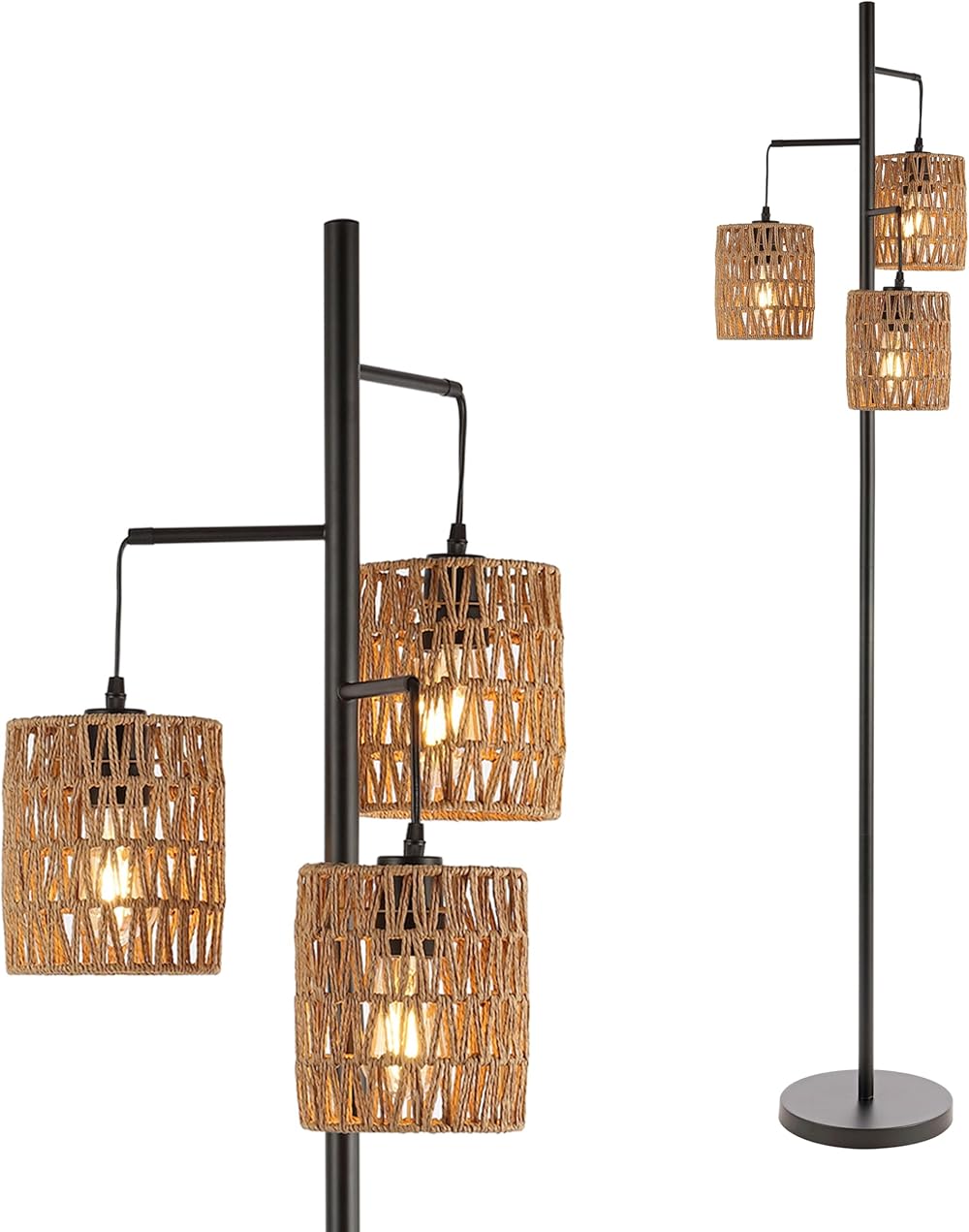 JYL1150A Isla 70.75" 3-Light Mid-Century Bohemian Metal/Rope LED Floor Lamp for Bedroom, Living Room, Office, Black/Natural
