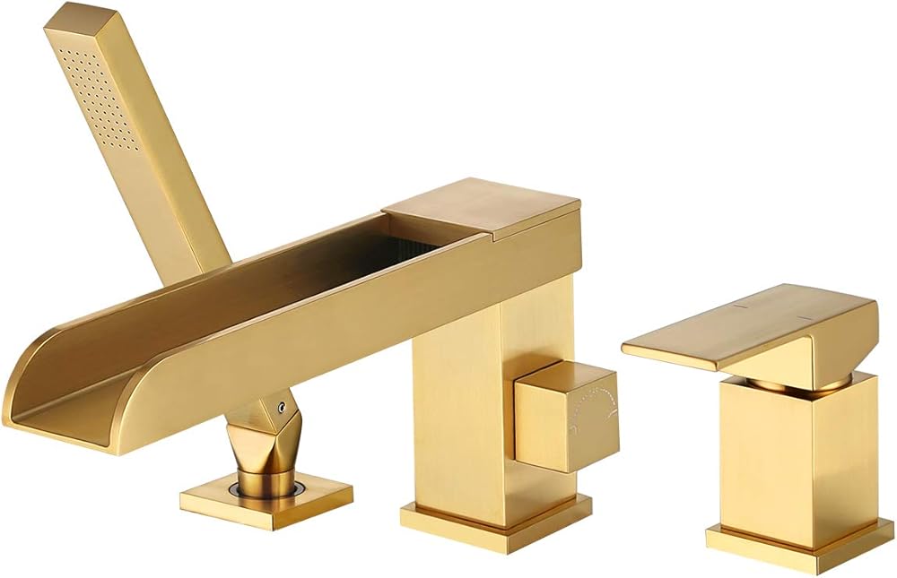 Waterfall Roman Tub Faucets Deck Mount Brushed Gold Bathtub Faucets Brass Tub Filler Bathroom Faucets with Hand Shower