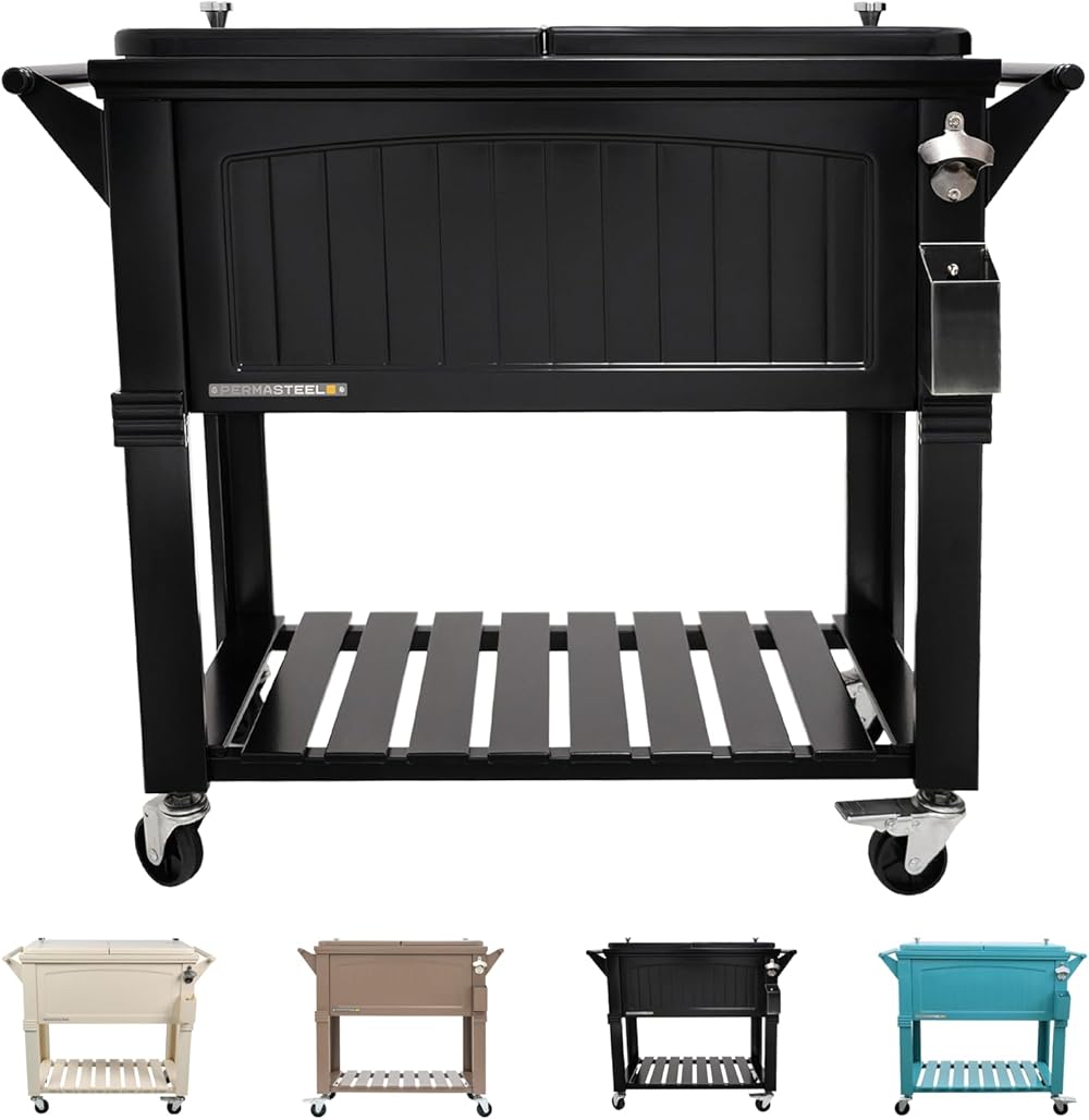Permasteel 80-Qt Antique Patio Cooler for Outside | Outdoor Beverage Cooler Bar Cart, Rolling Cooler with Wheels and Handles, Wooden Teak Accent, Black