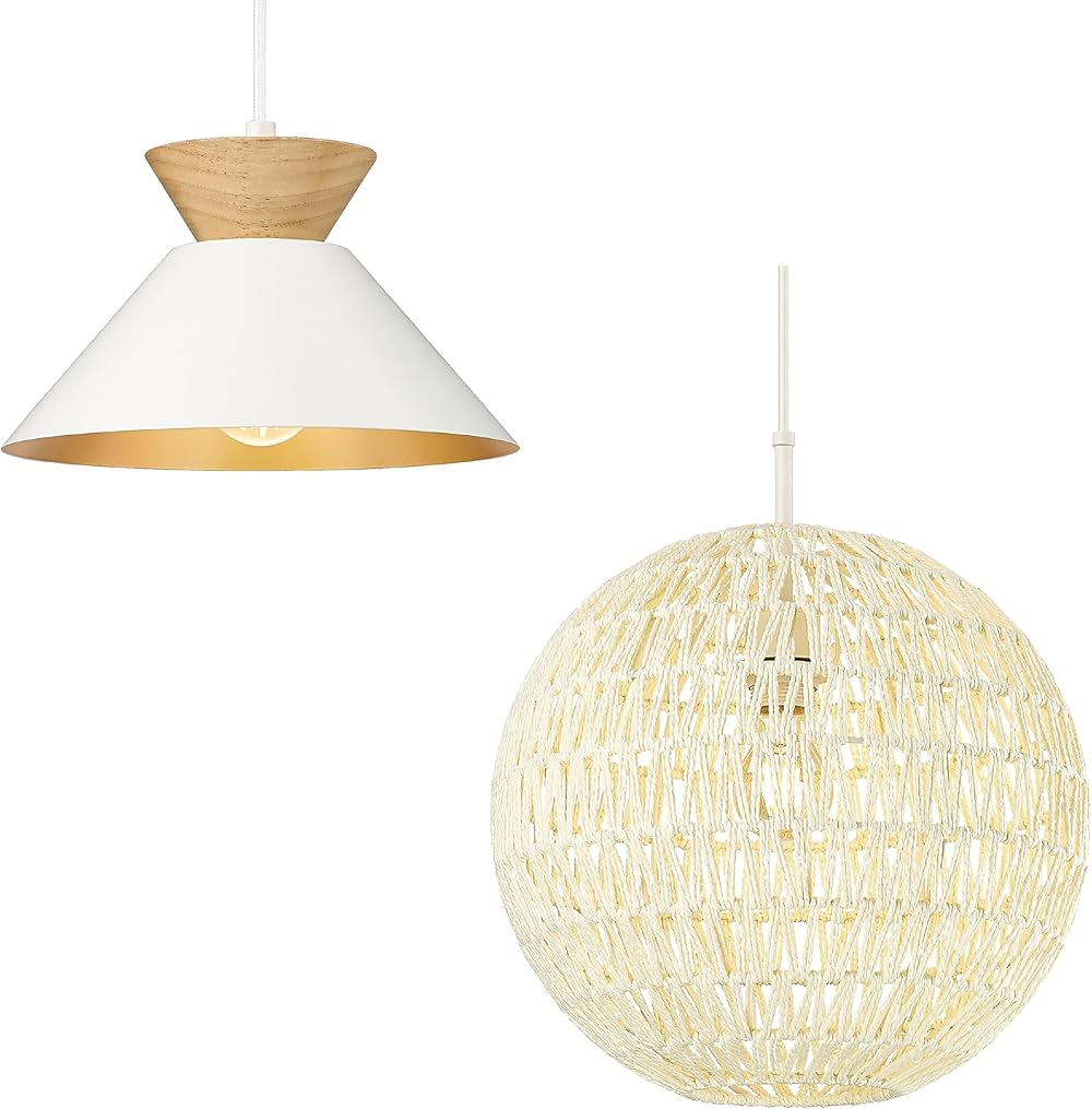 Modern Solid Wood Hanging Lamp with Matte White Metal Shade/Gold Inner Finish & Bohemian Woven Rattan Hanging Light Fixtures for Dining Room, Bedroom, Living Room, Hallway