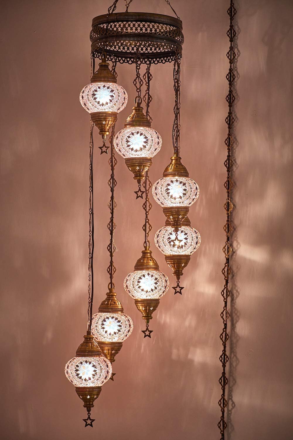 7 Globes Swag Plug in Turkish Moroccan Mosaic Bohemian Tiffany Ceiling Hanging Pendant Light Lamp Chandelier Lighting with 15feet Cord Chain and Plug, 50" Height (Purple)