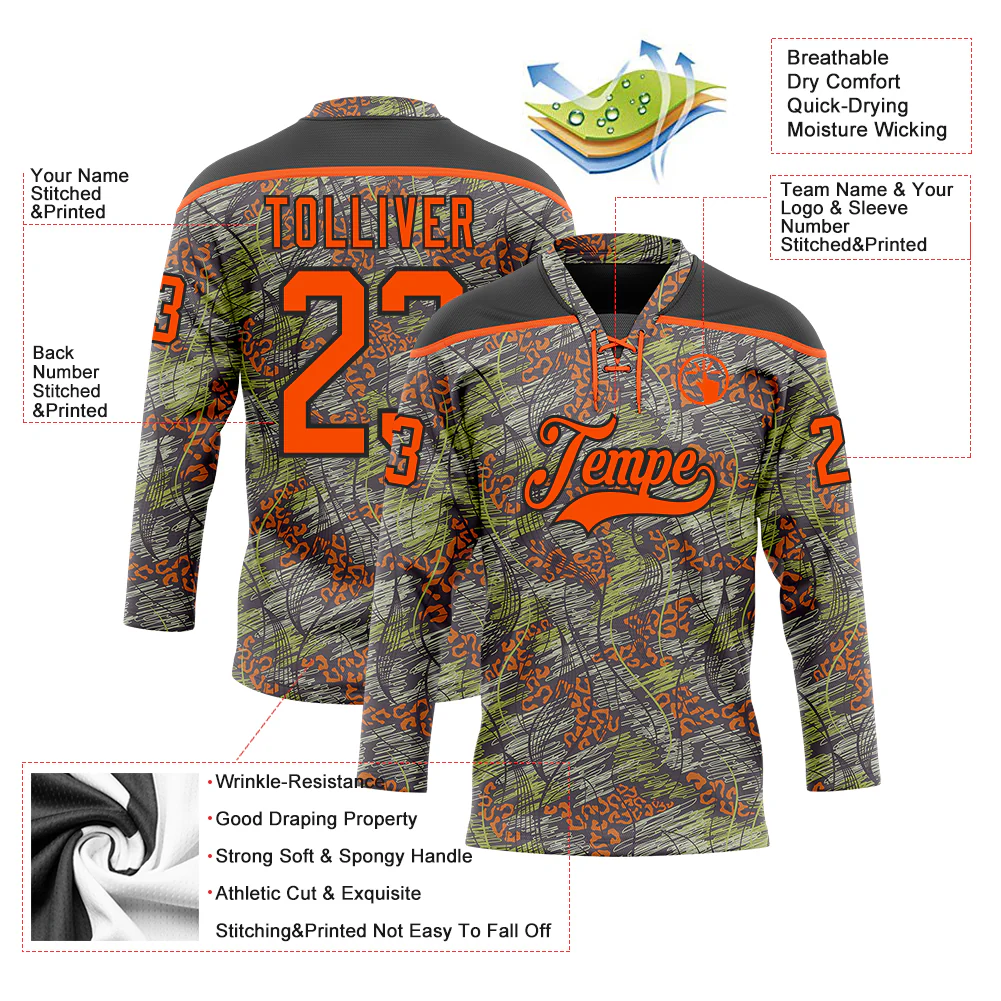 Custom Camo Orange-Black 3D Camouflage Grunge Leopard Hockey Lace Neck Jersey