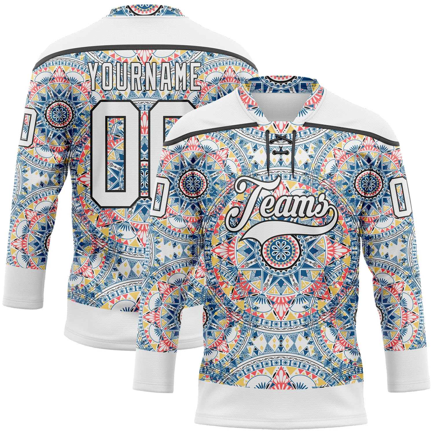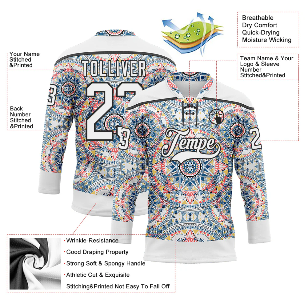 Custom White Black 3D Pattern Native Americans Tribal Indigenous People Hockey Lace Neck Jersey