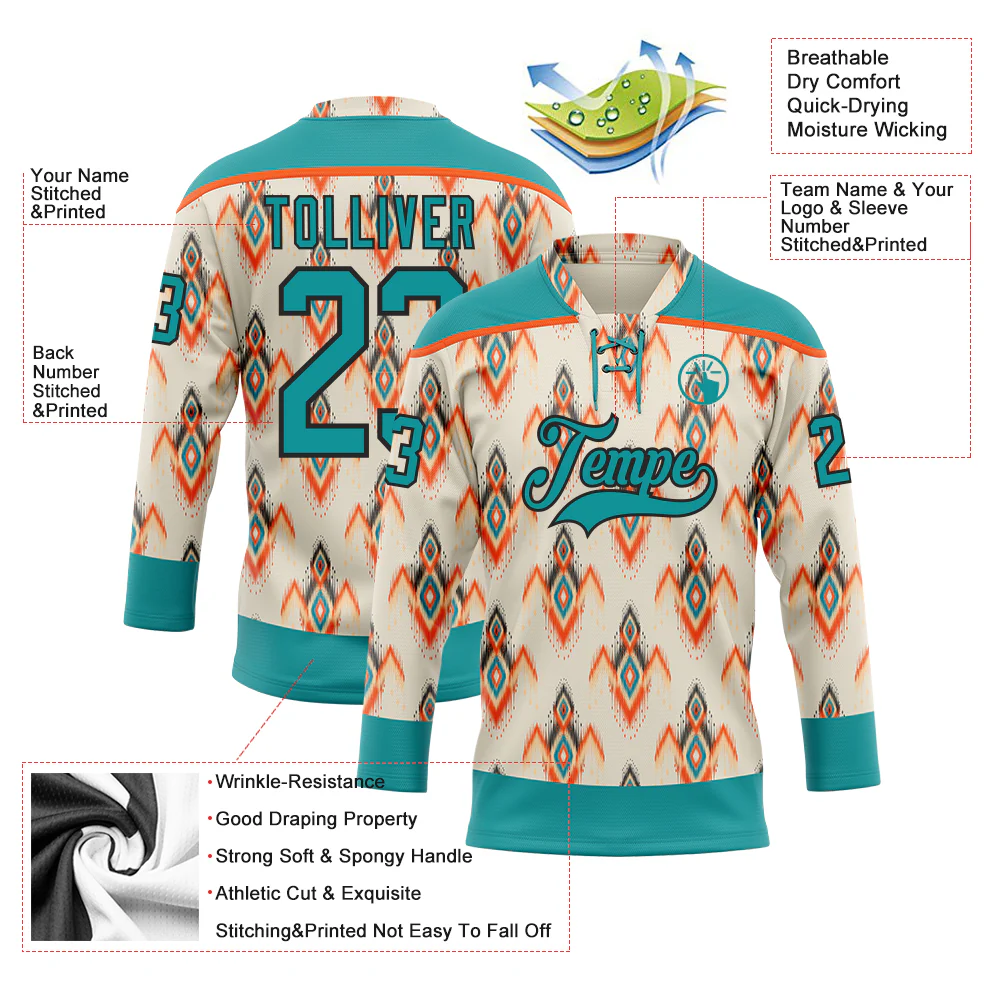 Custom Cream Teal Orange-Black 3D Pattern Native Americans Tribal Indigenous People Hockey Lace Neck Jersey