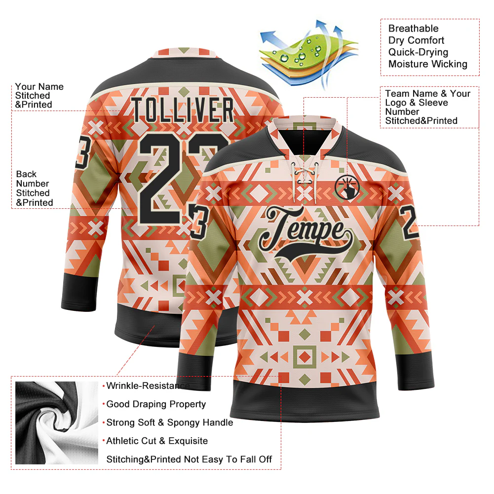 Custom Black Orange-Cream 3D Pattern Native Americans Tribal Indigenous People Hockey Lace Neck Jersey