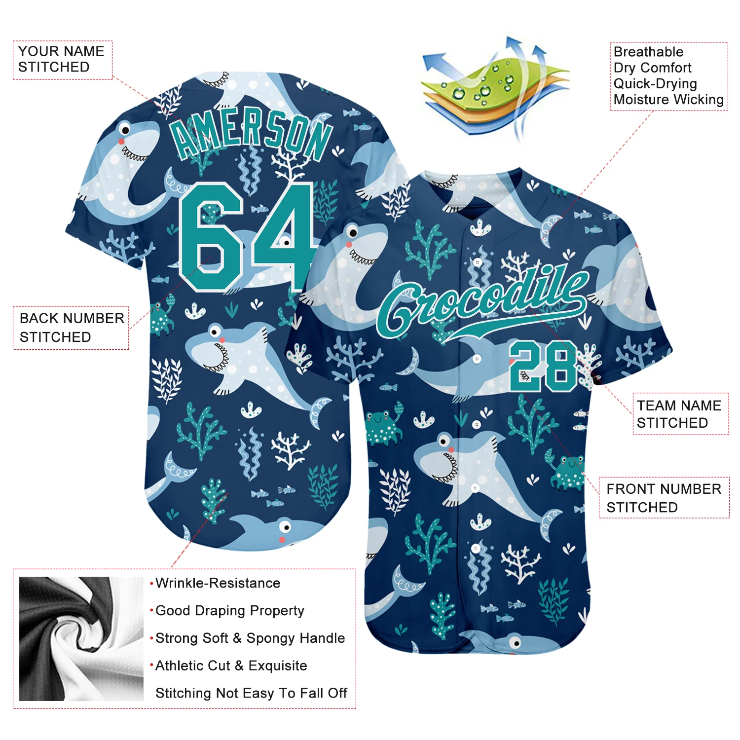Custom Teal Teal-White 3D Pattern Design Sharks Authentic Baseball Jersey