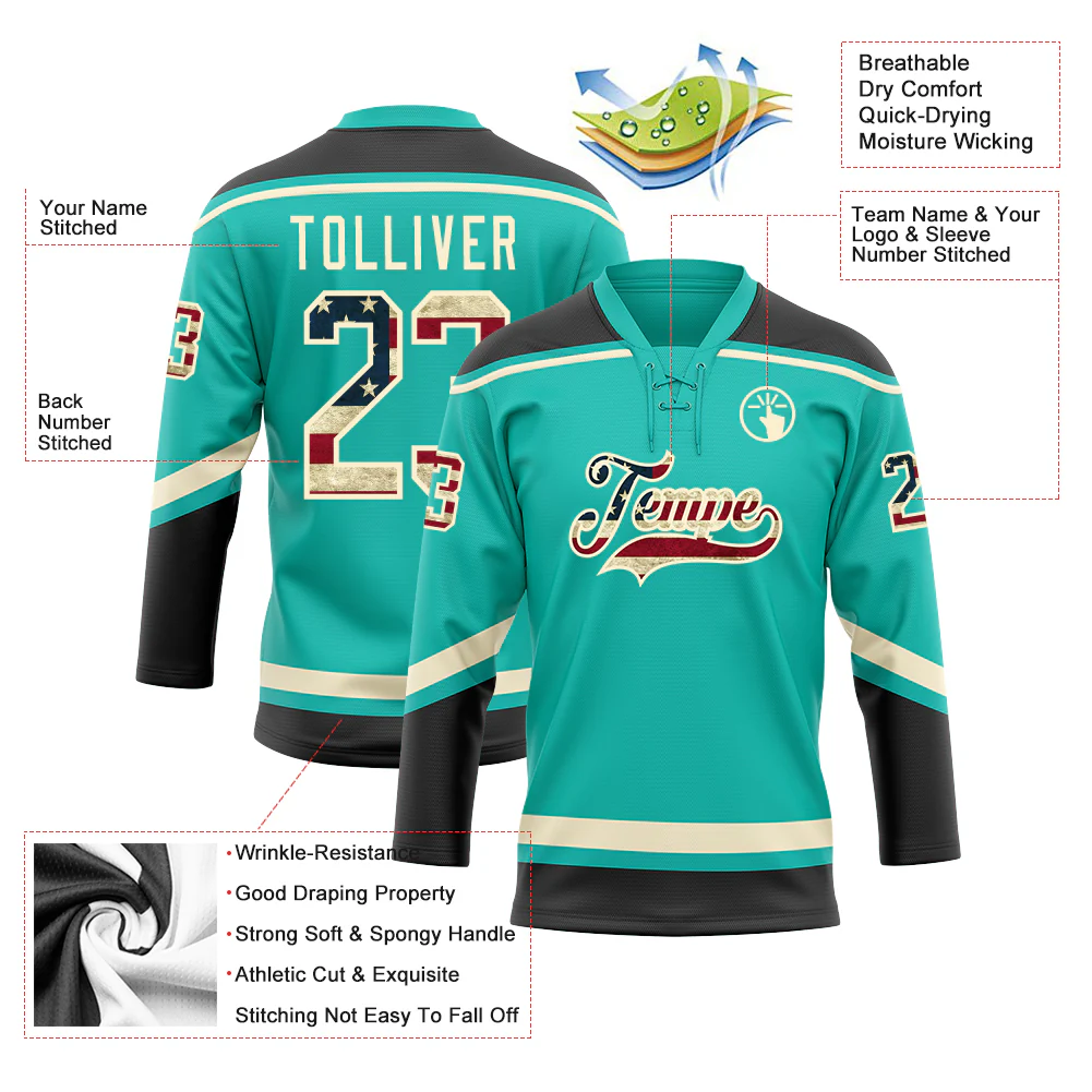 Custom Aqua Vintage USA Flag Black-Cream Hockey Lace Neck Jersey