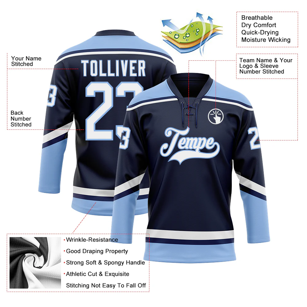 Custom Navy White-Light Blue Hockey Lace Neck Jersey