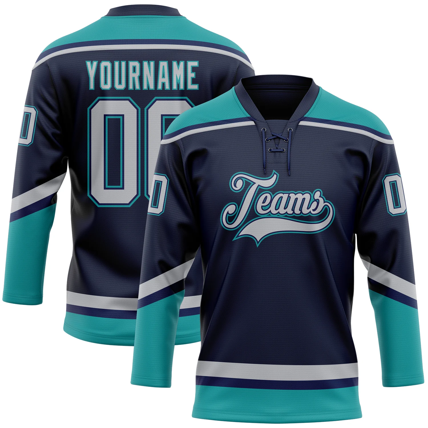 Custom Navy Gray-Teal Hockey Lace Neck Jersey