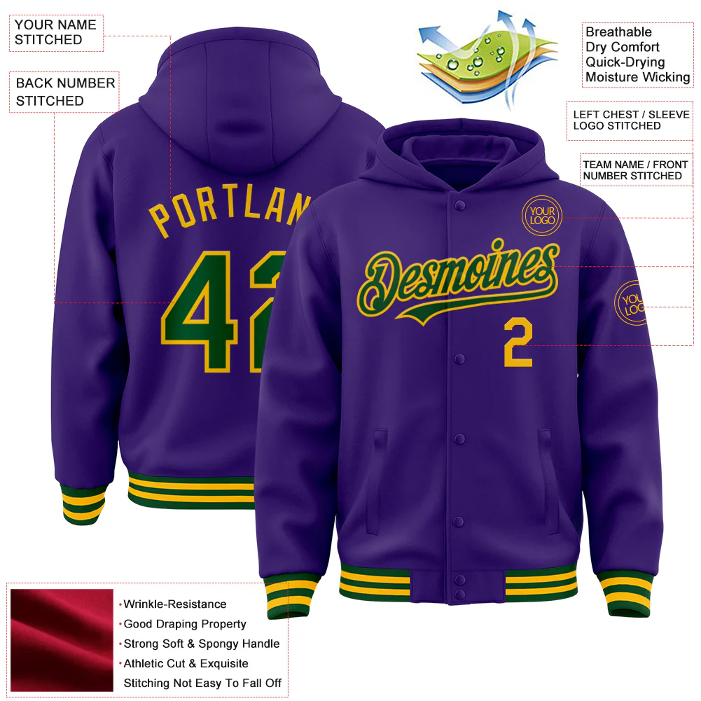 Custom Purple Green-Gold Bomber Full-Snap Varsity Letterman Hoodie Jacket