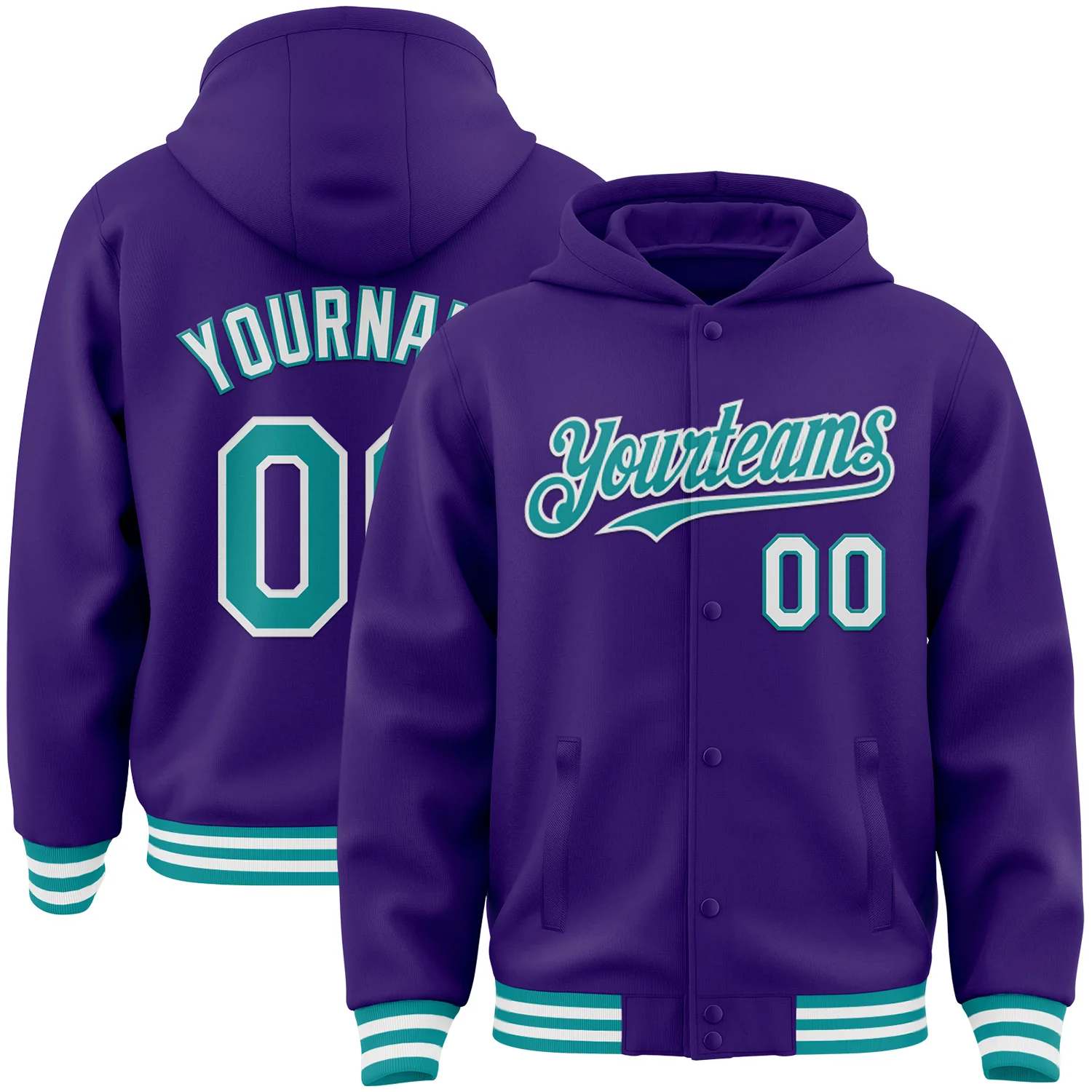 Custom Purple Teal-White Bomber Full-Snap Varsity Letterman Hoodie Jacket