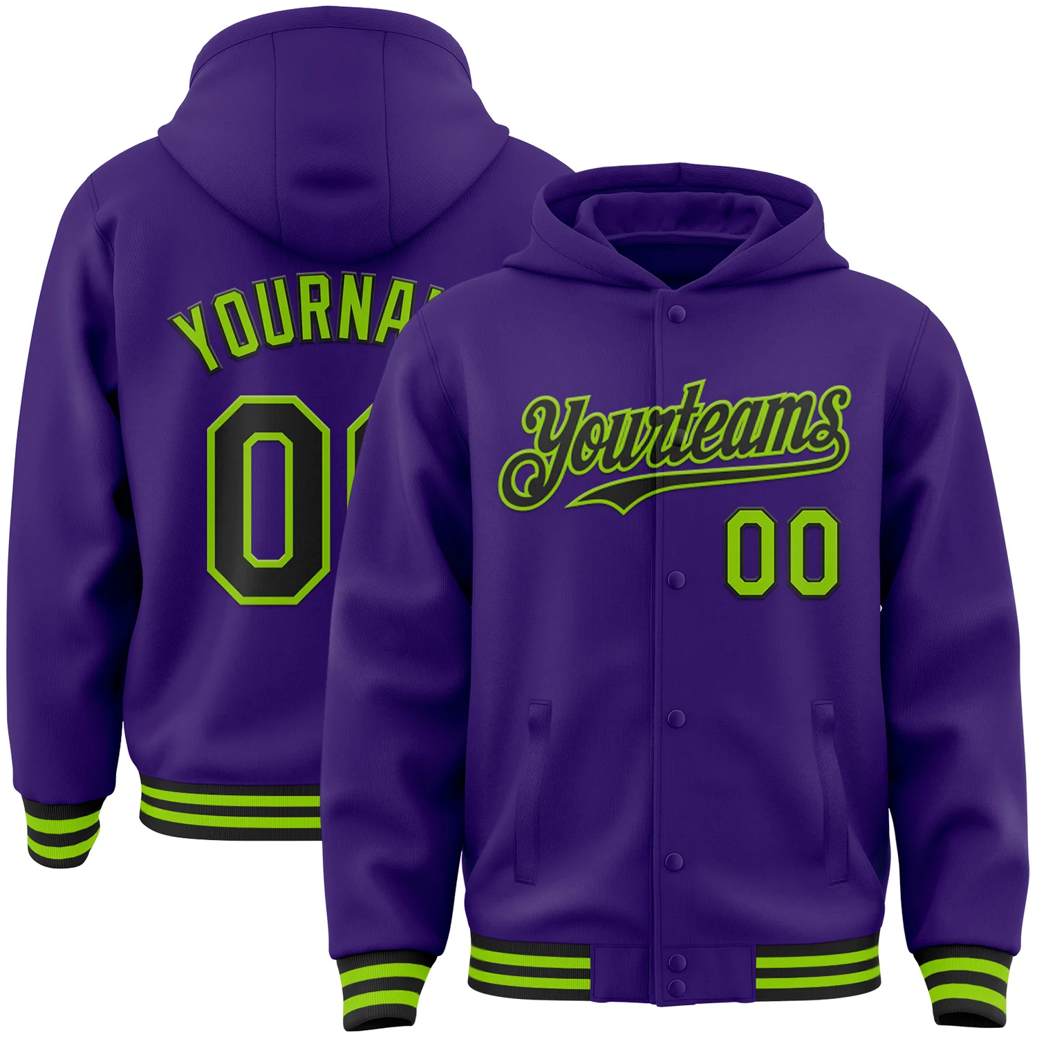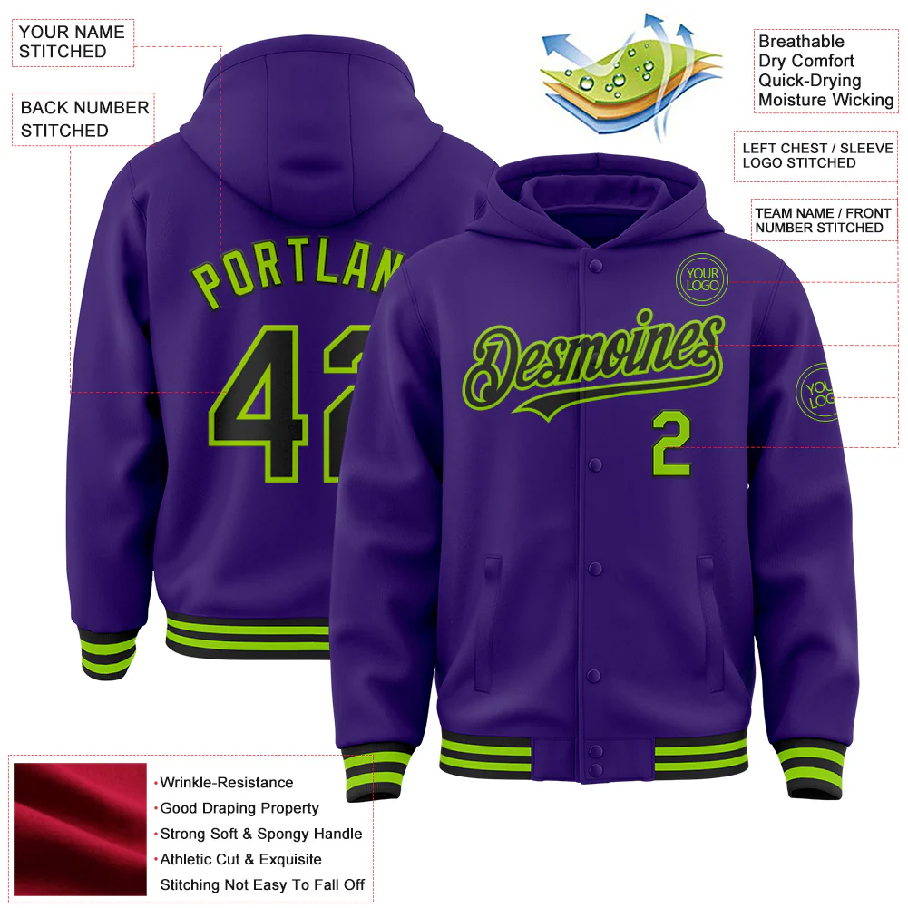Custom Purple Black-Neon Green Bomber Full-Snap Varsity Letterman Hoodie Jacket