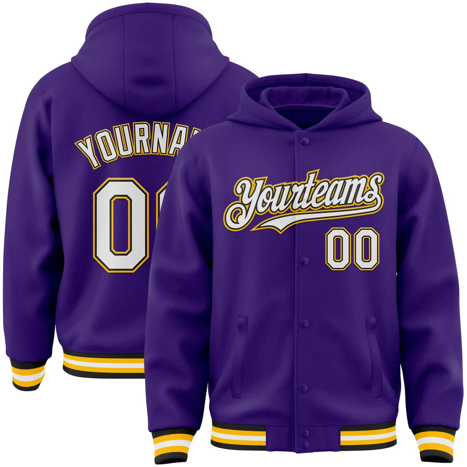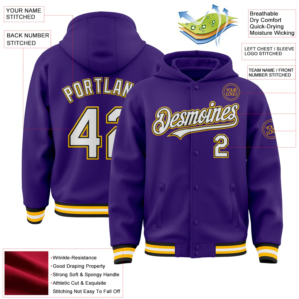 Custom Purple Black-Gold Bomber Full-Snap Varsity Letterman Hoodie Jacket