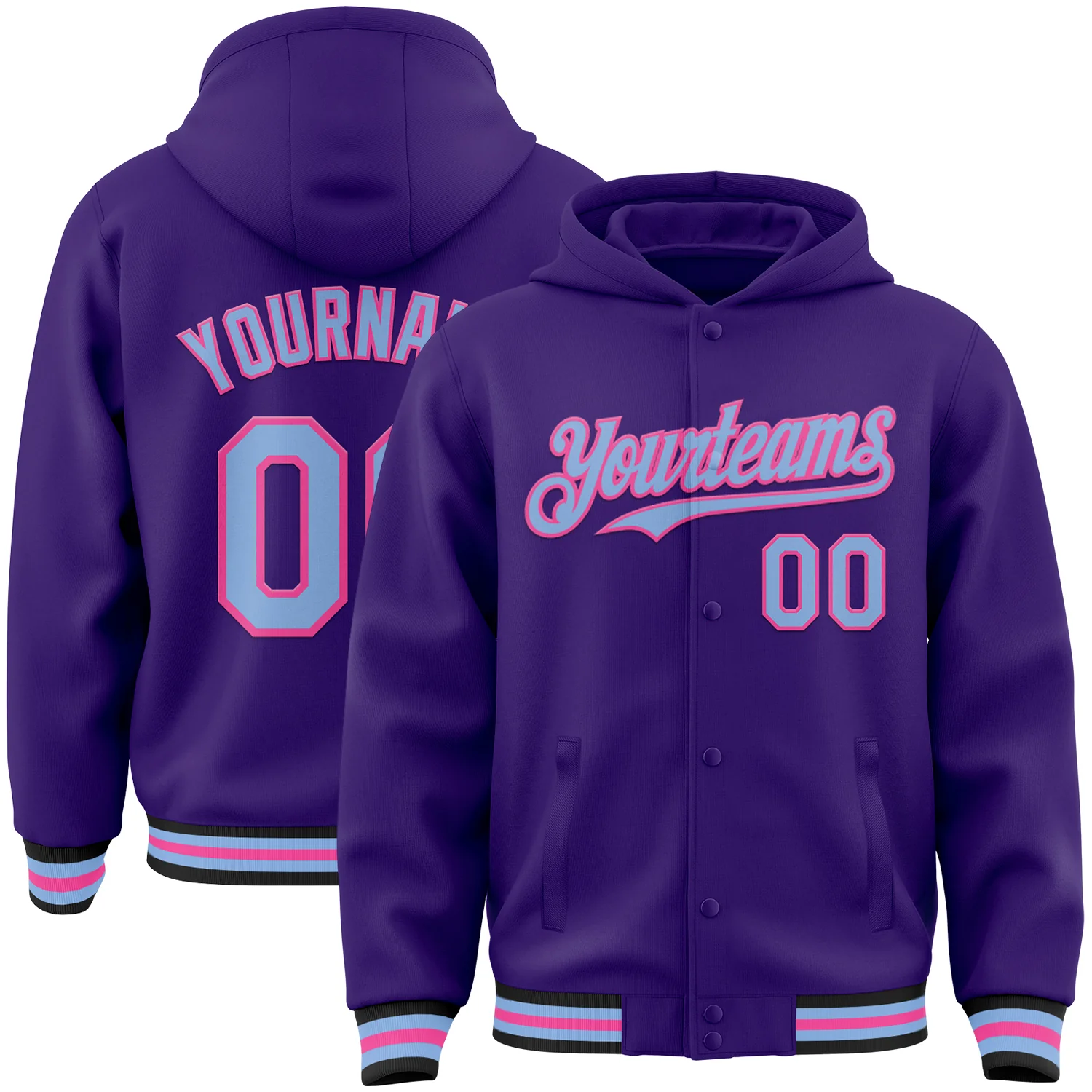 Custom Purple Sky Blue Pink-Black Bomber Full-Snap Varsity Letterman Hoodie Jacket