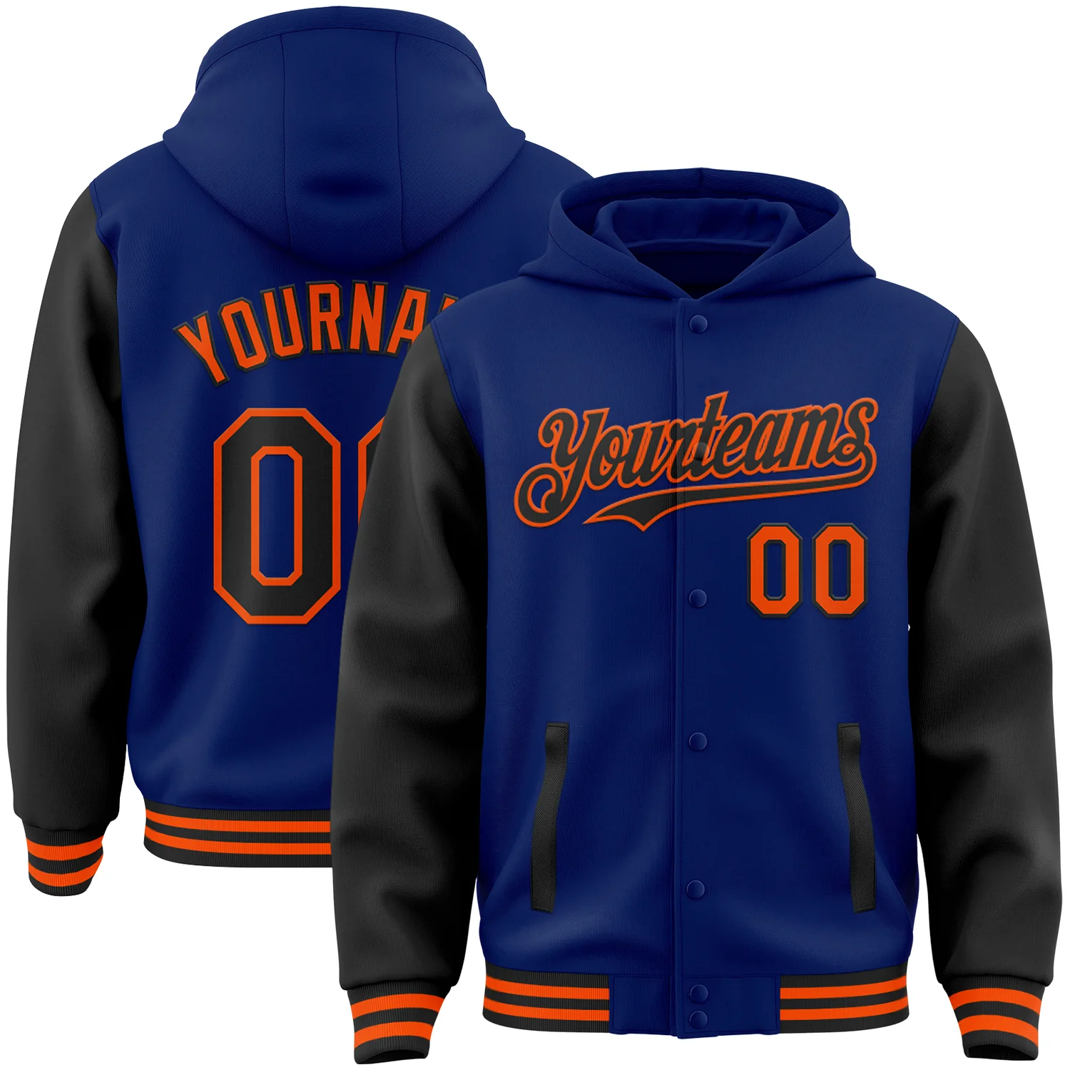 Custom Royal Black-Orange Bomber Full-Snap Varsity Letterman Two Tone Hoodie Jacket