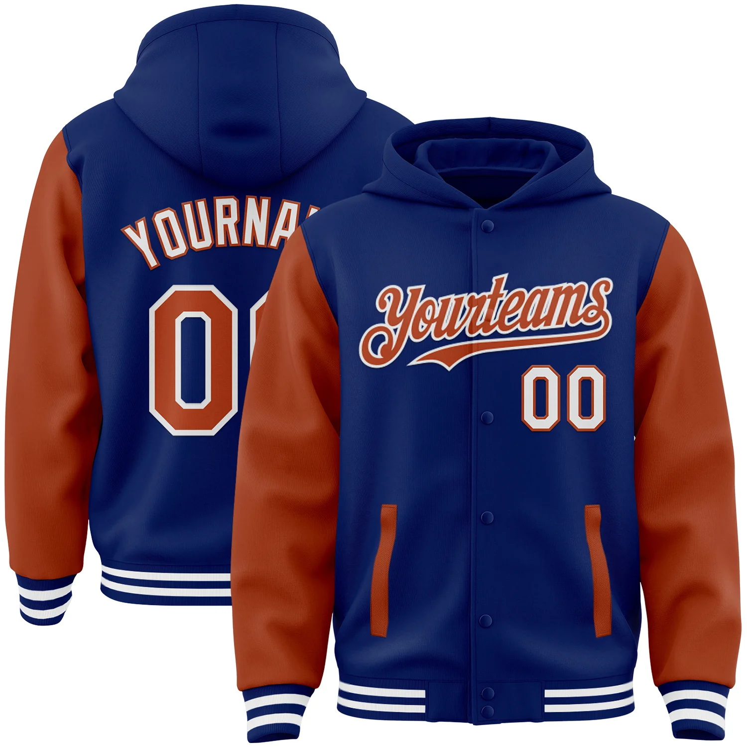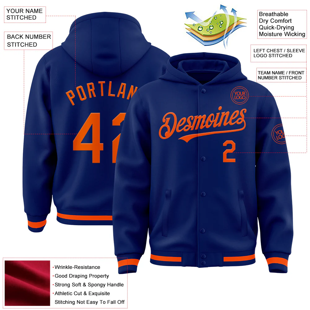 Custom Royal Orange Bomber Full-Snap Varsity Letterman Hoodie Jacket