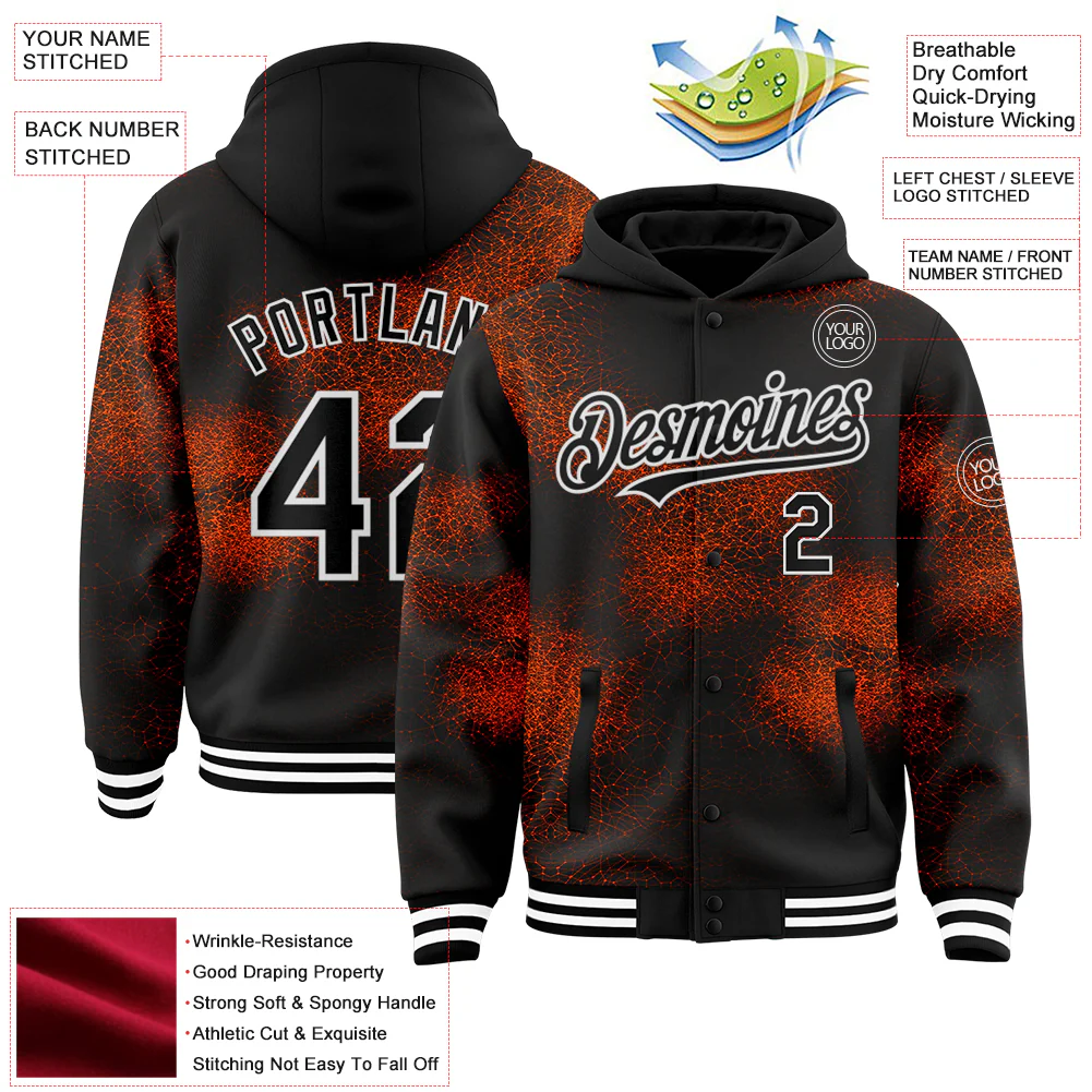 Custom Black Orange-White Abstract Network 3D Pattern Design Bomber Full-Snap Varsity Letterman Hoodie Jacket