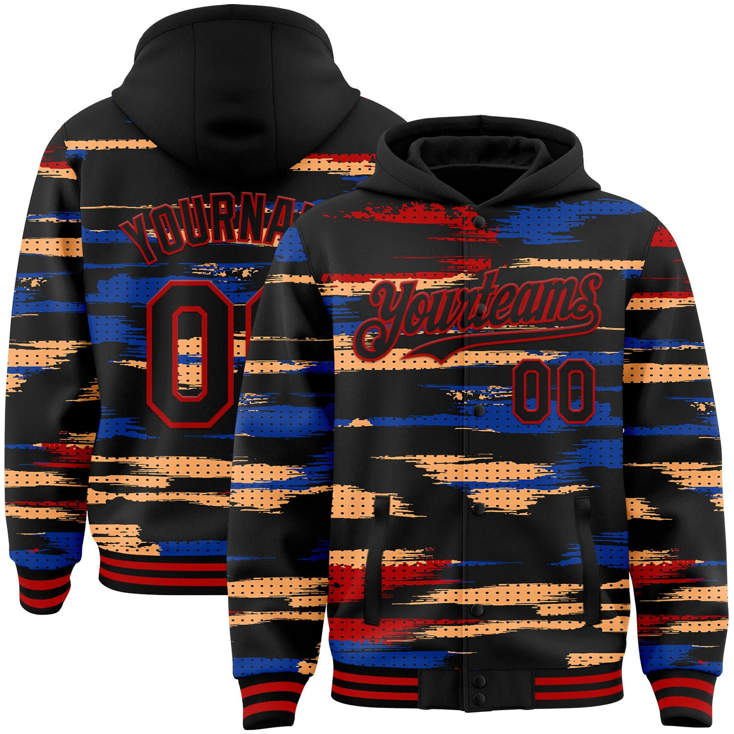 Custom Black Red-White Abstract Network 3D Pattern Design Bomber Full-Snap Varsity Letterman Hoodie Jacket