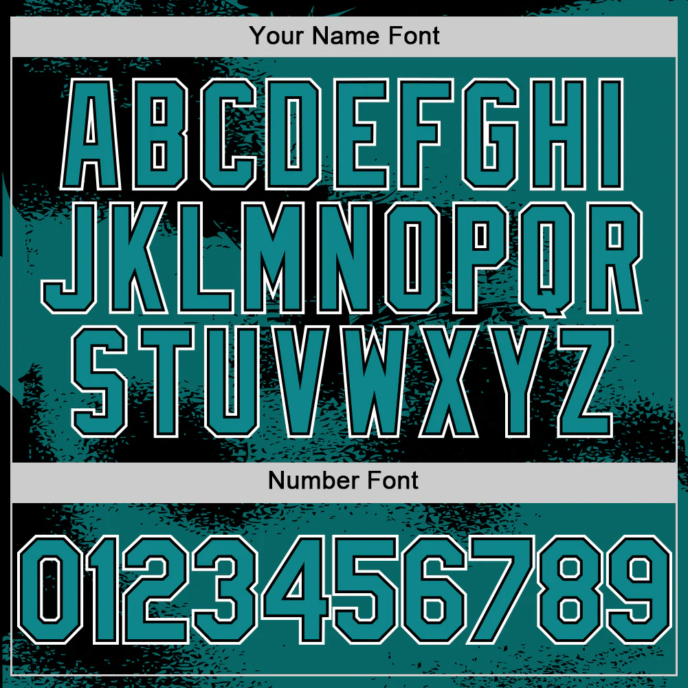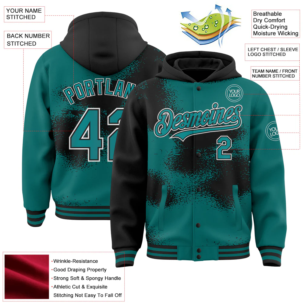 Custom Teal Black-White Abstract Color Blocks Fragment Art 3D Pattern Design Bomber Full-Snap Varsity Letterman Hoodie Jacket
