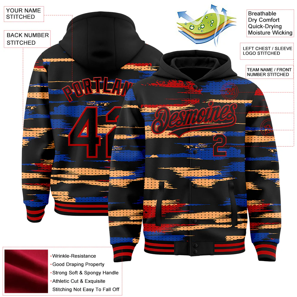 Custom Black Red Royal-Yellow Abstract Color Blocks 3D Pattern Design Bomber Full-Snap Varsity Letterman Hoodie Jacket