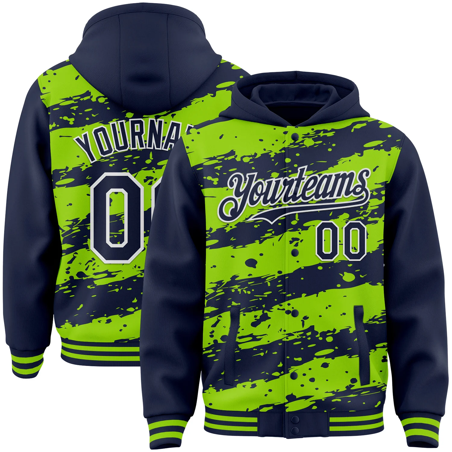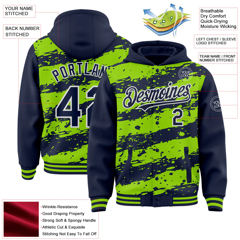 Custom Neon Green Navy-White Splash 3D Pattern Design Bomber Full-Snap Varsity Letterman Hoodie Jacket