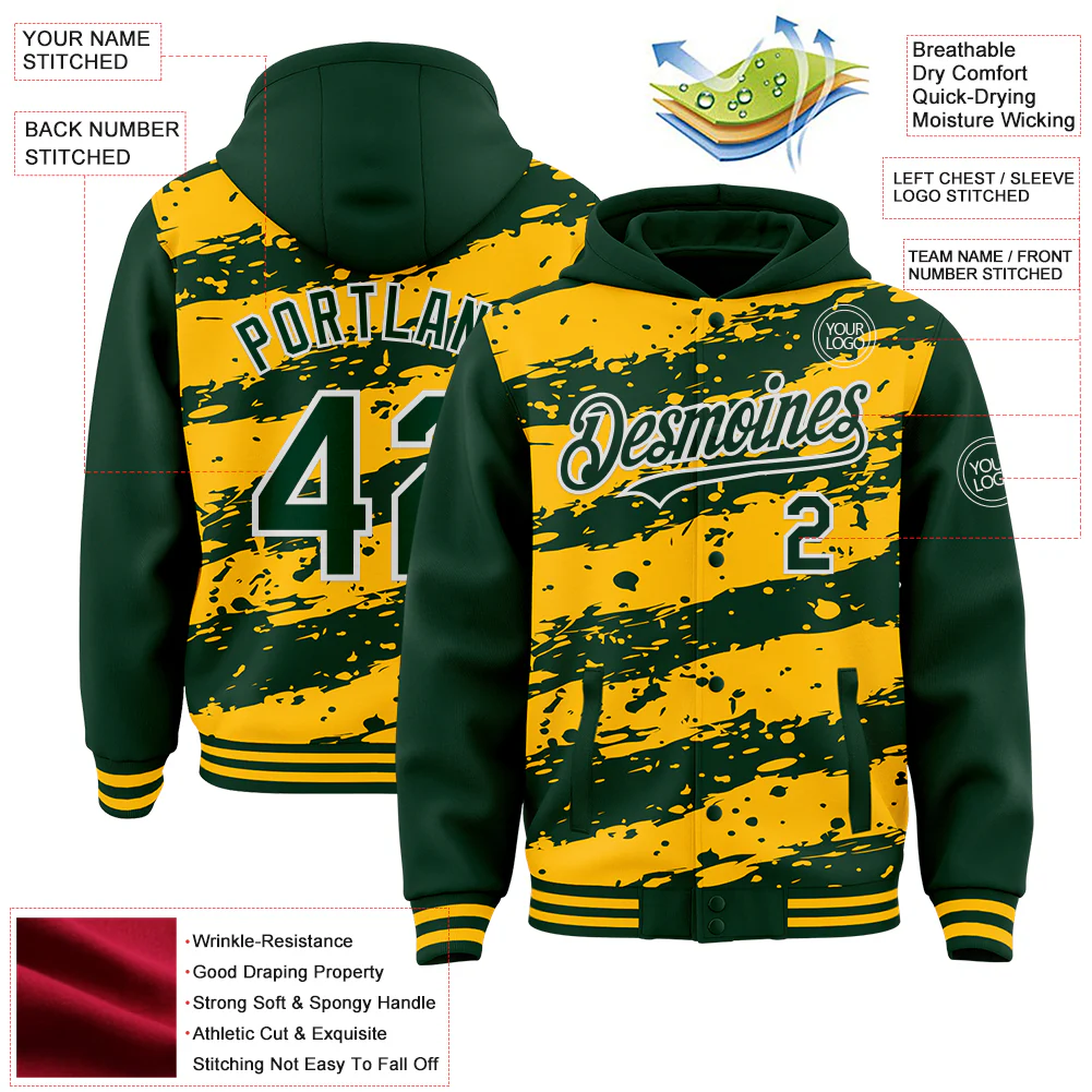 Custom Gold Green-White Splash 3D Pattern Design Bomber Full-Snap Varsity Letterman Hoodie Jacket