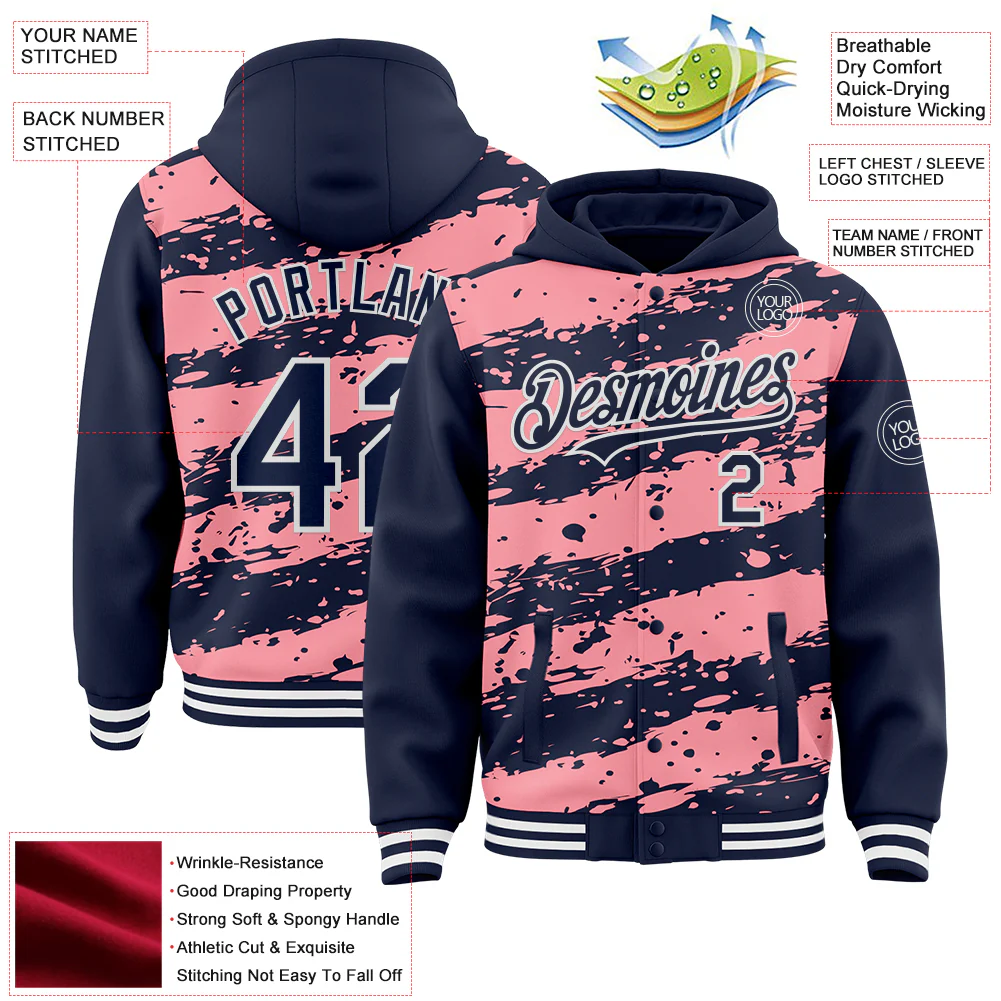 Custom Medium Pink Navy-White Splash 3D Pattern Design Bomber Full-Snap Varsity Letterman Hoodie Jacket