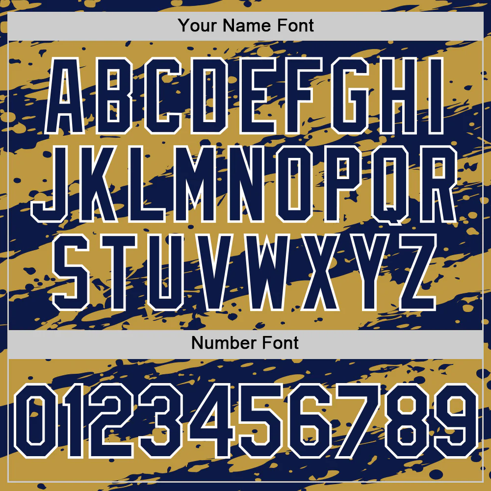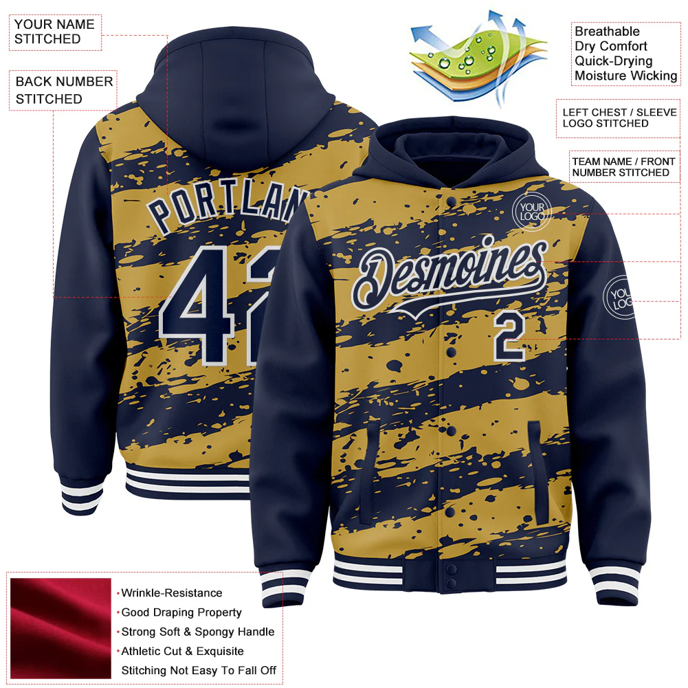 Custom Old Gold Navy-White Splash 3D Pattern Design Bomber Full-Snap Varsity Letterman Hoodie Jacket