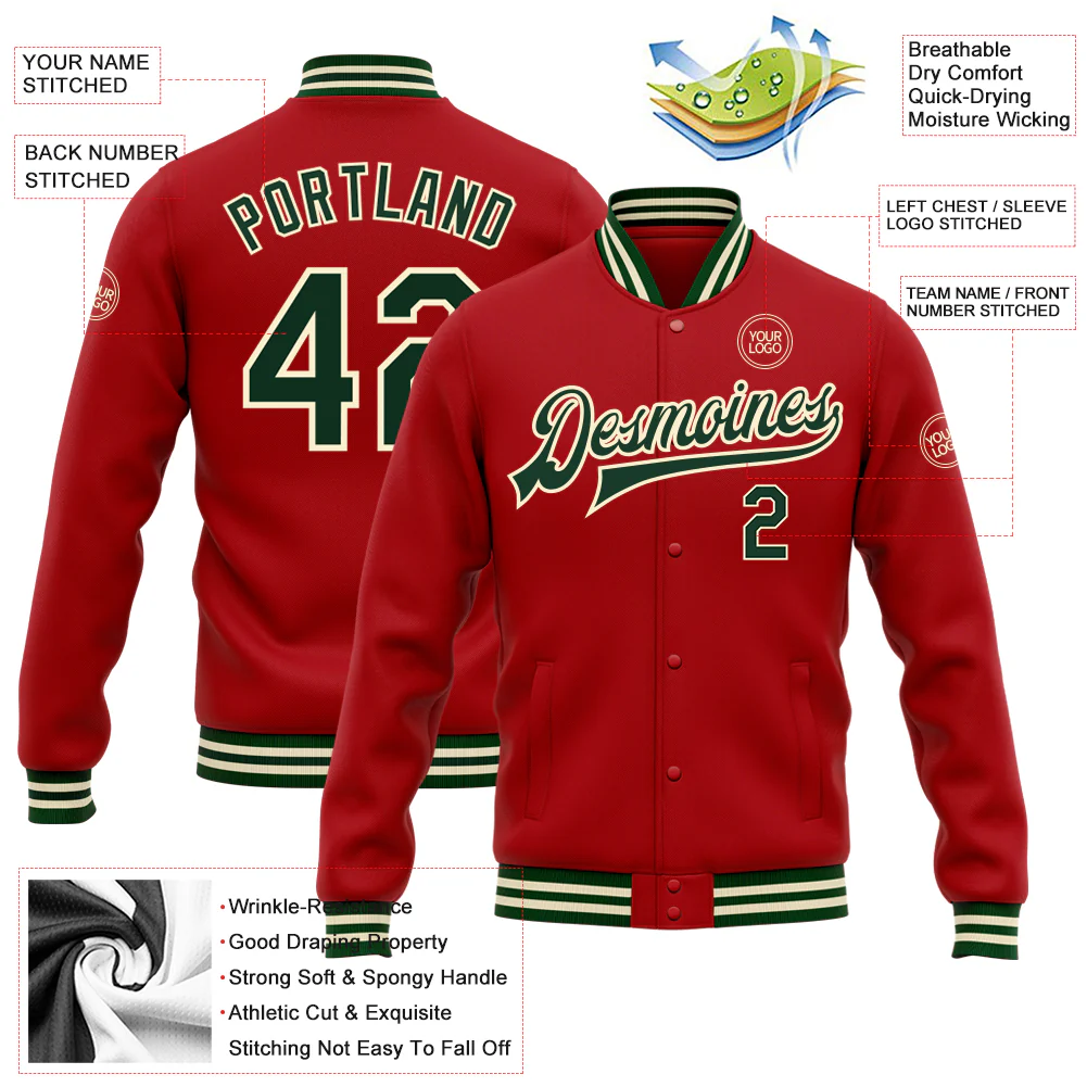 Custom Red Kelly Green Cream-Black Bomber Full-Snap Varsity Letterman Jacket