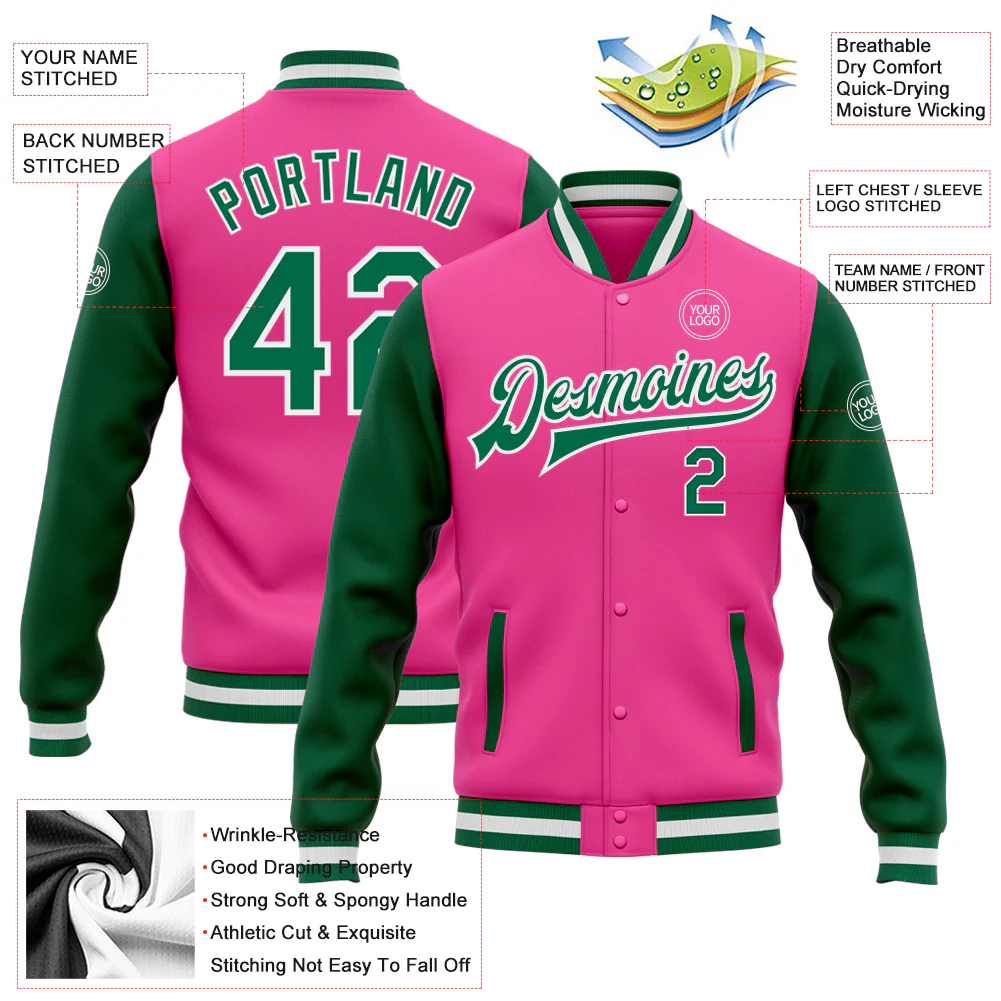 Custom Pink Kelly Green-White Bomber Full-Snap Varsity Letterman Two Tone Jacket